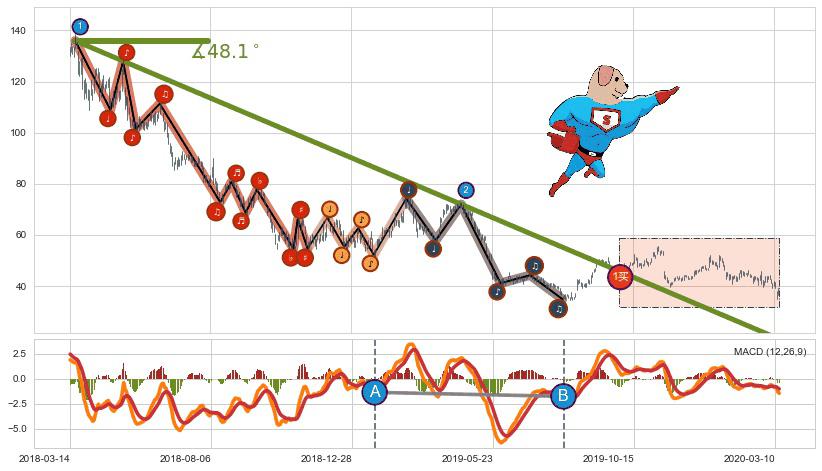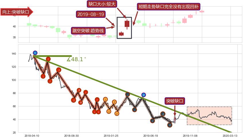 从2018-03-20至2019-08-30,共包含366个交易日,阶段股价下跌-97.89%,阶段股价变动位移路程比: 1 : 9,下跌趋势角度: 48.1