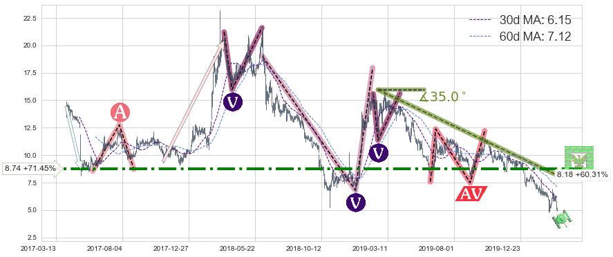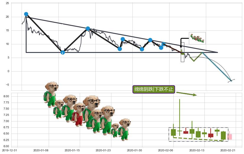 ➢ 【多方力量耗尽,空方打破攻守平衡点】下降三角形中继整理, 已在2020-02-06突破【支撑】颈线 6.87 →演变成下降通道