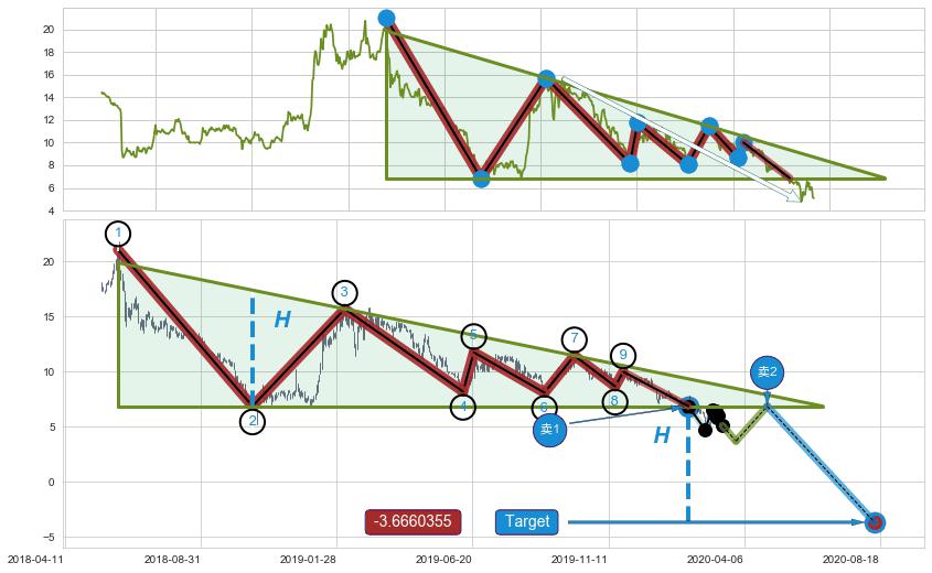 | 2 🅚:【死亡谷】卖出点 ➕ 📐:下降三角整理下行突破支撑位破位, 猜想持续下沉下跌,被突破的支撑位已变为阻力位 ☞ 看空信号 ⇥ 【均线】交织【图形】⇥ 综合量化分数: 30 | > |