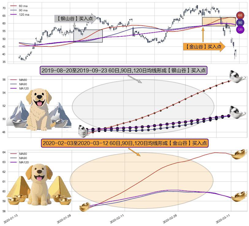⚀ 2020-02-04-日至2020-03-12-日显现 60日-90日-120日均线 【金山谷】买入点 其再次确认了买入信号,可靠性更强,买入