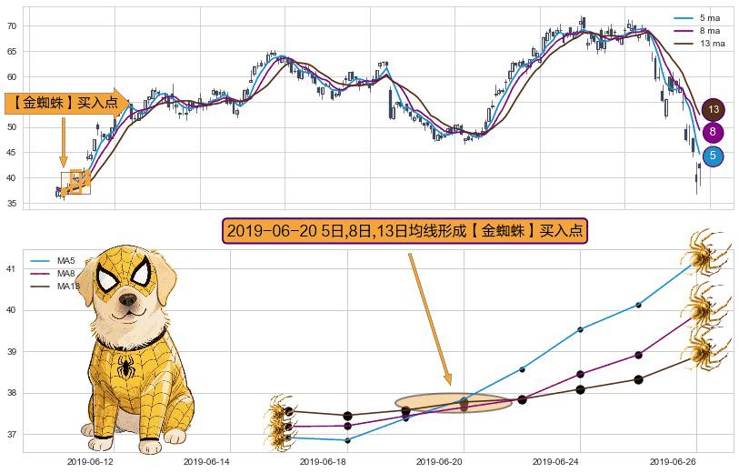 ⚀ 2019-06-20日显现 5日-8日-13日均线 【金蜘蛛】买入点 看多信号,后市看涨,买入