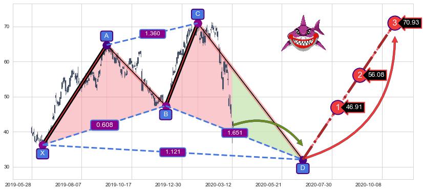 ➢ 接近预测D点位置, 随时警戒看涨【鲨鱼】形态反转启动