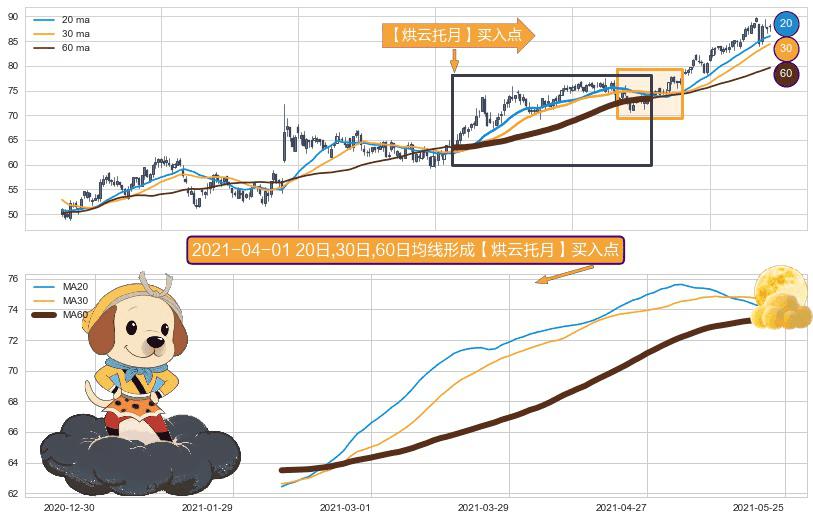 形态多维评估: ⚀ 2021-02-09日-2021-05-21日显现 20日-30日-60日均线 【烘云托月】买入点 看多信号,后市看涨,买入