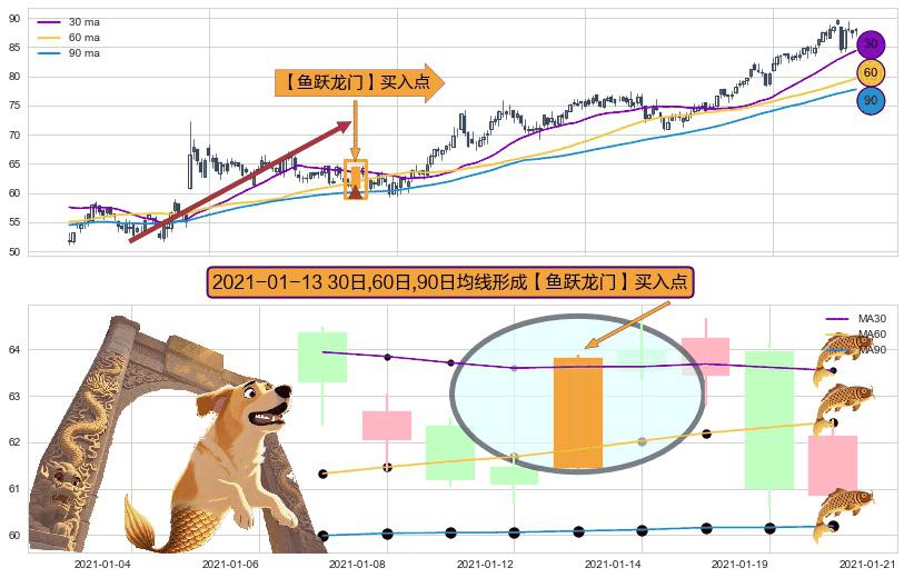 形态多维评估: ⚀ 2021-01-13日显现 30日-60日-90日均线 【鱼跃龙门】买入点 看多信号,后市看涨,买入