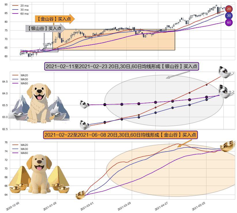 ⚃ 2021-02-23-日至2021-06-08-日显现 20日-30日-60日均线 【金山谷】买入点 其再次确认了买入信号,可靠性更强,买入