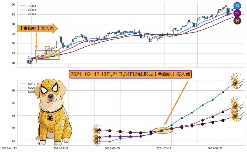 形态多维评估: ⚀ 2021-02-12日显现 13日-21日-34日均线 【金蜘蛛】买入点 看多信号,后市看涨,买入