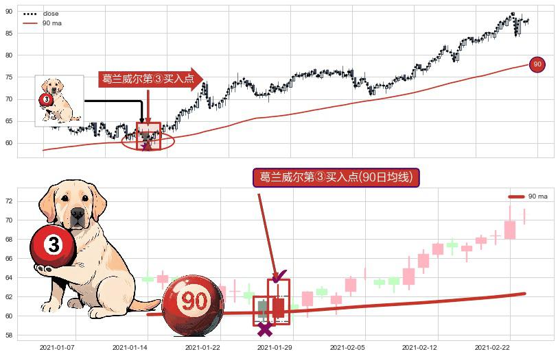 形态多维评估: ⚀ 2021-01-28-日显现 葛兰威尔均线 90日均线 第③买入点 上升趋势的中继信号,后市看涨,买进信号