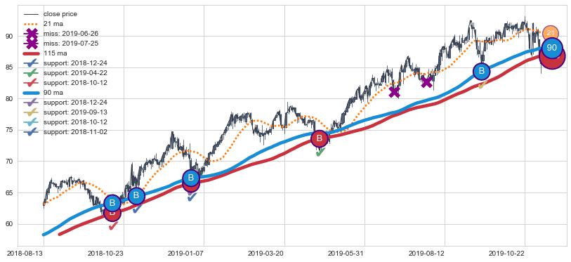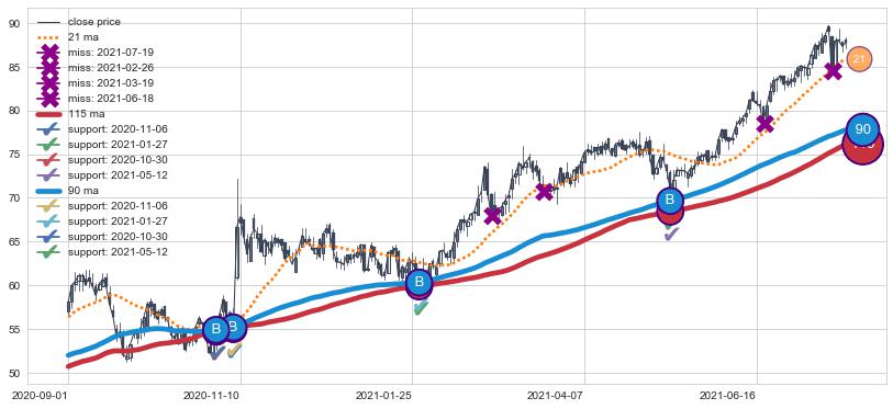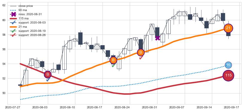 上涨趋势2020-09-01-2021-07-23,均线90, 115确认关键支撑4处