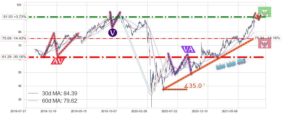 ♘ 阻力价格位91.03,可信任强度73.71%,距离最后交易2021-07-23形成的收盘价格87.76相差 +3.73%