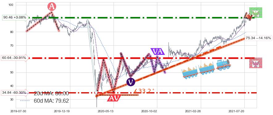 ♘ 阻力价格位90.46,可信任强度94.53%,距离最后交易2021-07-23形成的收盘价格87.76相差 +3.08%