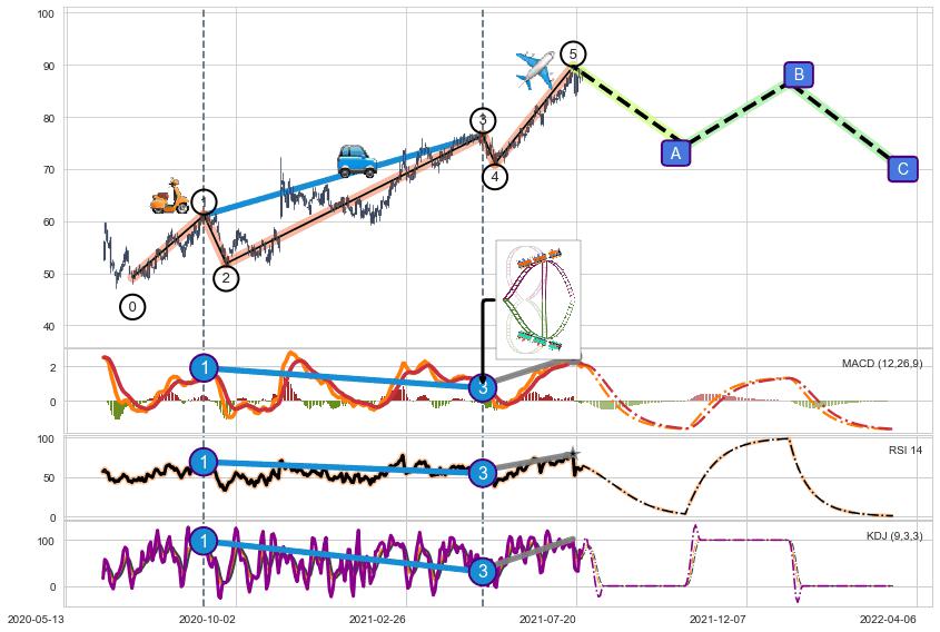 ➣ 1,3,5驱动浪MACD, RSI, KDJ走势都出现【常规背离】反转信号增强