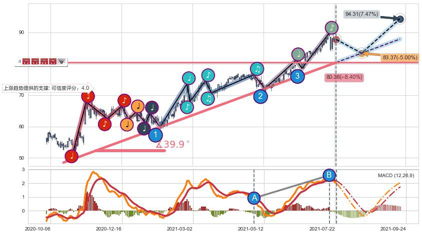 ♘ 在最后的上升阶段2020-10-19至2021-07-16存在 持续未破位的支撑位 ,支撑价格80.38,支撑可信任强度81.95%,其距离最后价格87.76相差 -8.40%