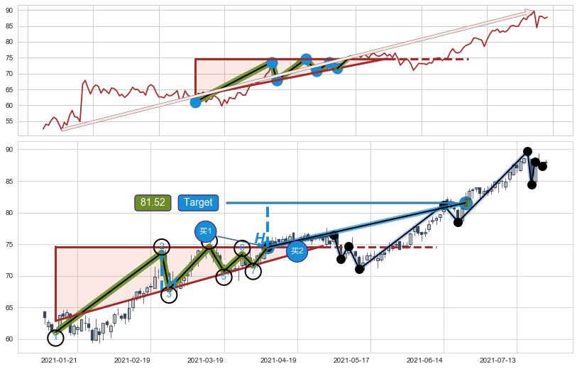 ➣ 【买2】: 保守型 买点 →(2021-04-19: 74.88 )形成上升三角形整理突破后的【回抽确认】