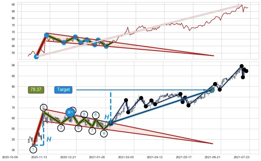 ➢ 【空方力量耗尽,多方打破攻守平衡点】上升三角形中继整理, 已在2021-04-07突破【阻力】颈线 74.55 →演变成上升通道