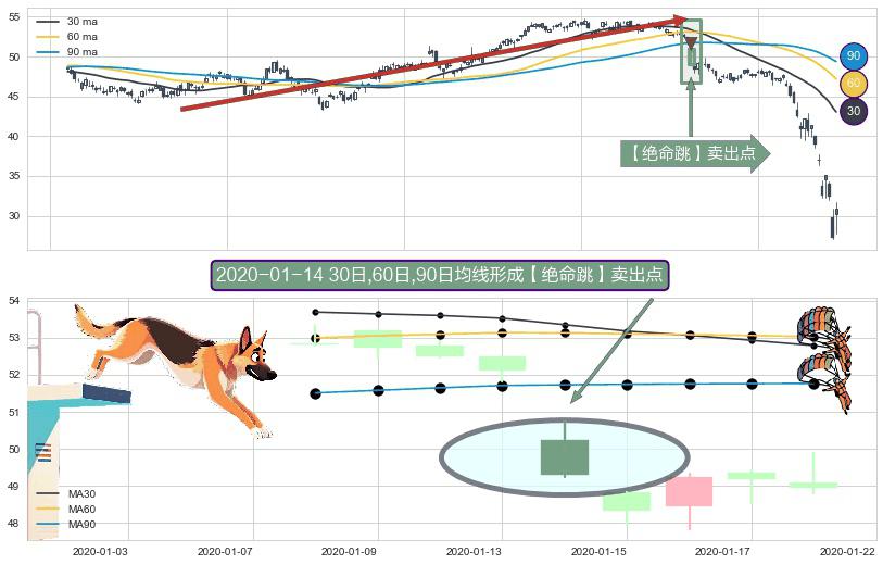 形态多维评估: ⚀ 2020-01-14日显现 30日-60日-90日均线 【绝命跳】卖出点 看空信号,后市看跌,卖出