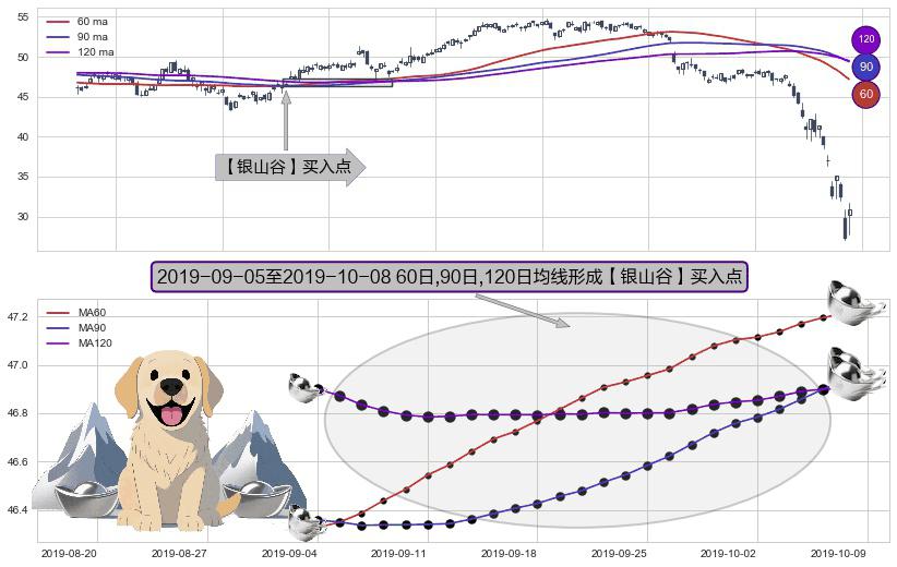 形态多维评估: ⚀ 2019-09-06-日至2019-10-08-日显现 60日-90日-120日均线 【银山谷】买入点 看多信号,后市看涨,买入