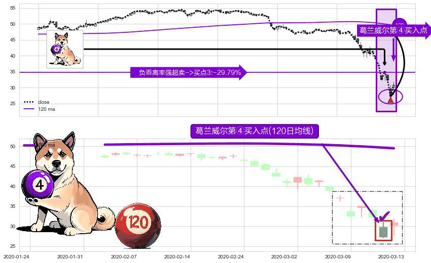 形态多维评估: ⚀ 2020-03-12-日显现 葛兰威尔均线 120日均线 第④买入点 下降趋势均值回复的短线反弹信号,后市看涨,买进信号