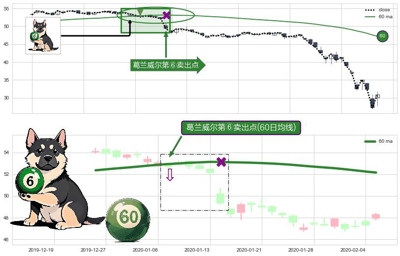 形态多维评估: ⚀ 2020-01-07-日显现 葛兰威尔均线 60日均线 第⑥卖出点 走势反转见顶信号,后市看跌,卖出信号