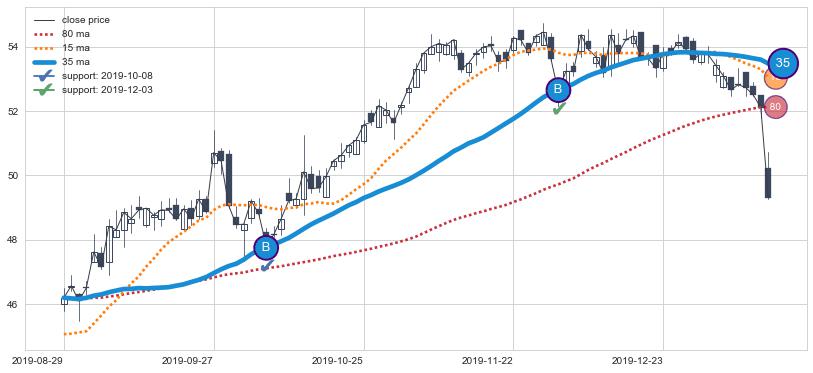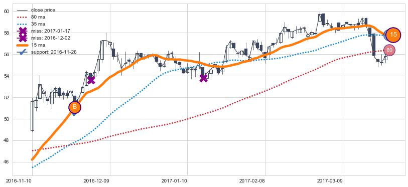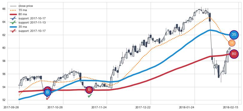 上涨趋势2017-09-28-2018-02-15,均线80, 35确认关键支撑2处