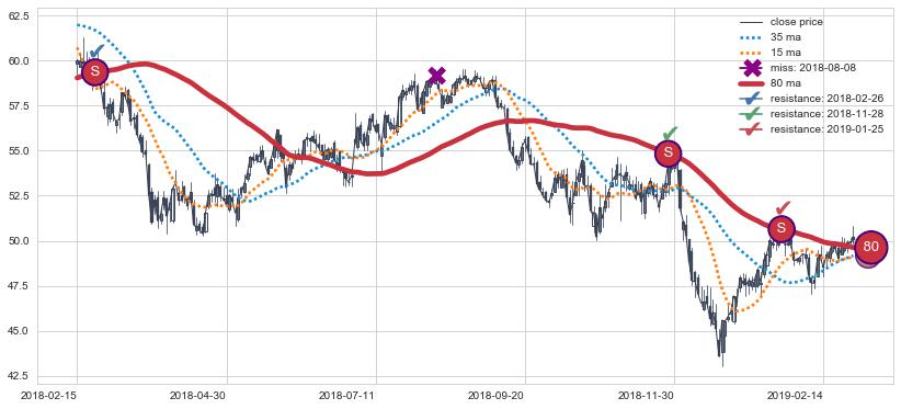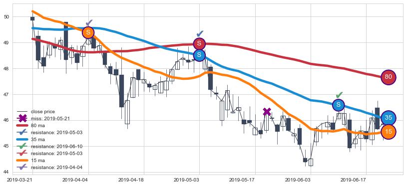 下跌趋势2019-03-21-2019-06-20,均线80, 35, 15确认关键阻力3处