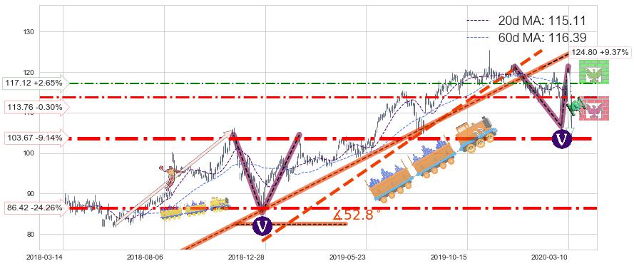 ♘ 阻力价格位117.12,可信任强度53.69%,距离最后交易2020-03-13形成的收盘价格114.10相差 +2.65%