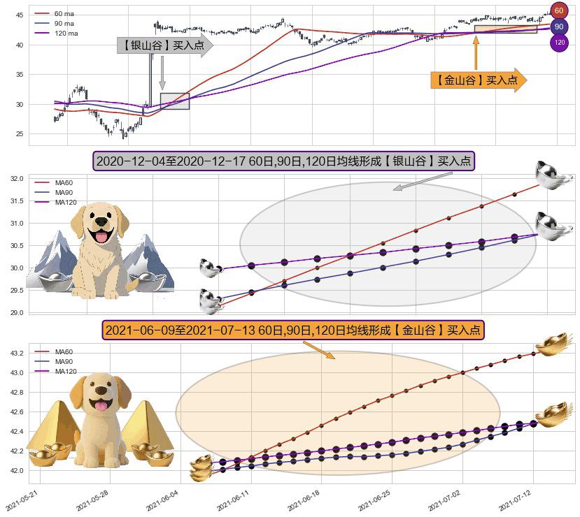 ⚃ 2021-06-10-日至2021-07-13-日显现 60日-90日-120日均线 【金山谷】买入点 其再次确认了买入信号,可靠性更强,买入