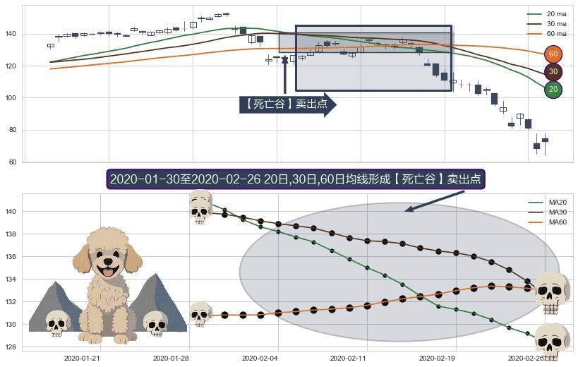 ⚂ 【死亡谷】卖出点 由MA20均线下穿MA30均线和MA60均线,MA30均线下穿MA60均线形成