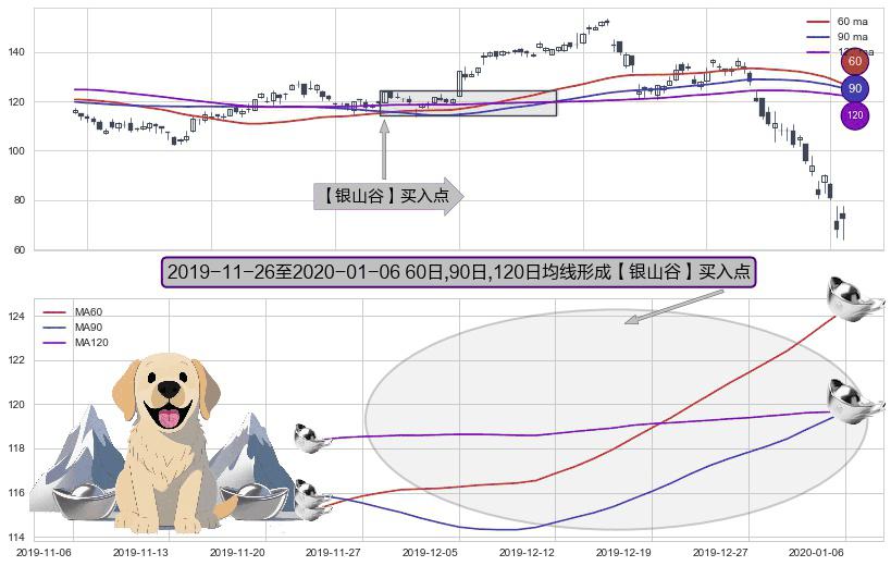形态多维评估: ⚀ 2019-11-27-日至2020-01-06-日显现 60日-90日-120日均线 【银山谷】买入点 看多信号,后市看涨,买入