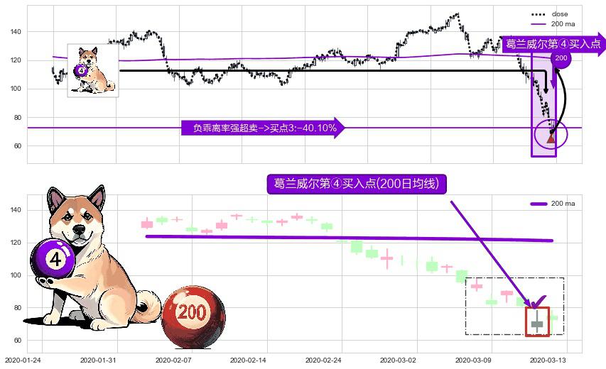 形态多维评估: ⚀ 2020-03-12-日显现 葛兰威尔均线 200日均线 第④买入点 下降趋势均值回复的短线反弹信号,后市看涨,买进信号