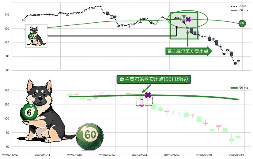 形态多维评估: ⚀ 2020-02-21-日显现 葛兰威尔均线 60日均线 第⑥卖出点 走势反转见顶信号,后市看跌,卖出信号