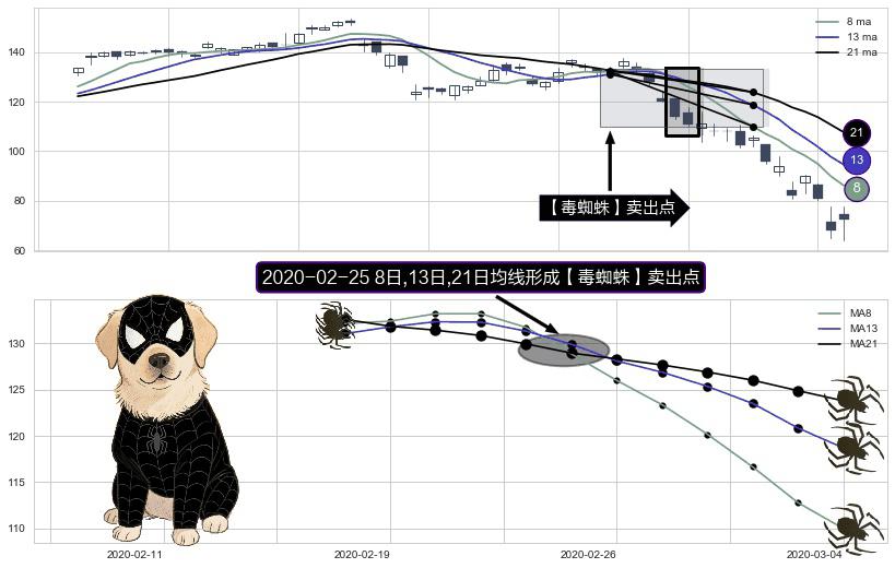 形态多维评估: ⚀ 2020-02-25日显现 8日-13日-21日均线 【毒蜘蛛】卖出点 看空信号,后市看跌,卖出