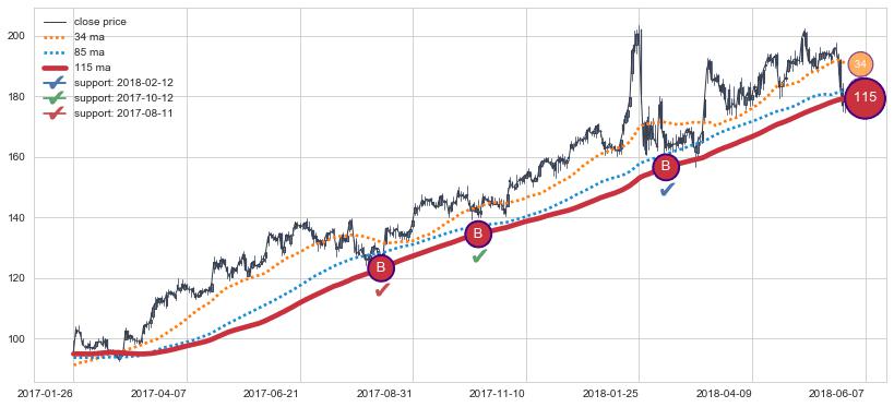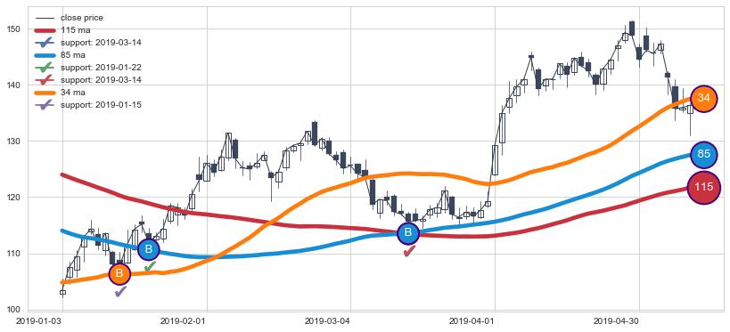 上涨趋势2019-01-03-2019-05-09,均线34, 115, 85确认关键支撑3处