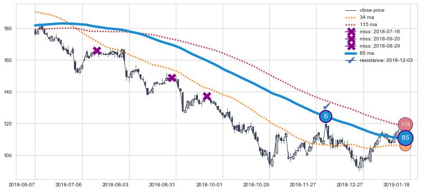 下跌趋势2018-06-07-2019-01-18,均线85确认关键阻力1处