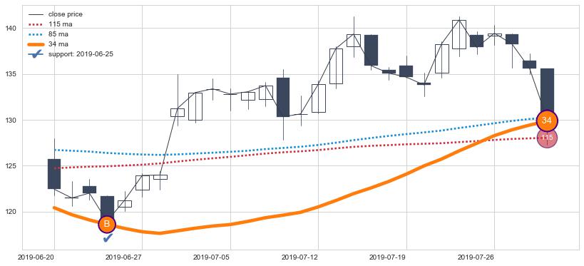 上涨趋势2019-06-20-2019-07-31,均线34确认关键支撑1处