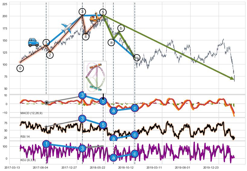 ➢ 1,3,5驱动浪MACD, RSI, KDJ走势都出现【常规背离】反转信号增强