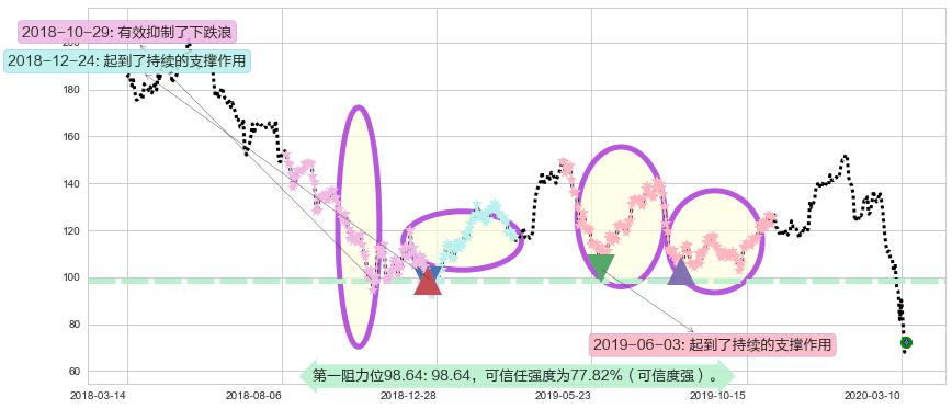 ♞ 第一阻力位98.64价格为98.64,其通过量化计算出的可信任强度为77.82%(可信度强)。