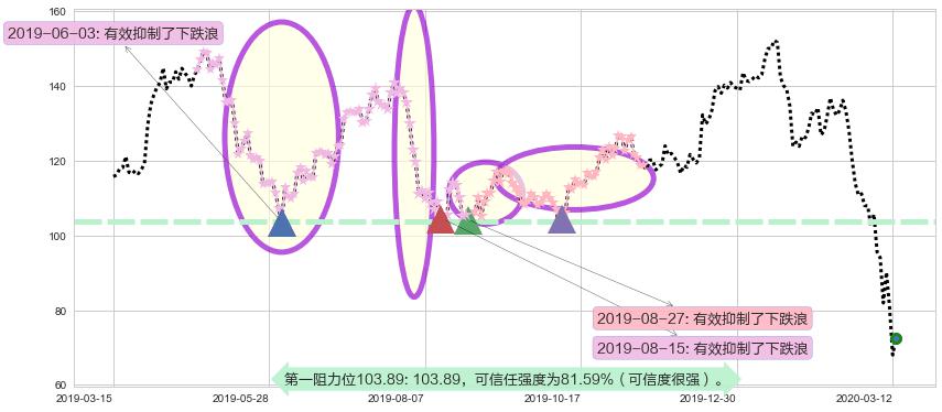 ♞ 第一阻力位103.89价格为103.89,其通过量化计算出的可信任强度为81.59%(可信度很强)。