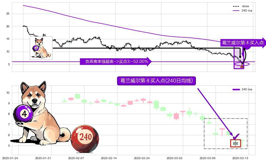 形态多维评估: ⚀ 2020-03-12-日显现 葛兰威尔均线 240日均线 第④买入点 下降趋势均值回复的短线反弹信号,后市看涨,买进信号