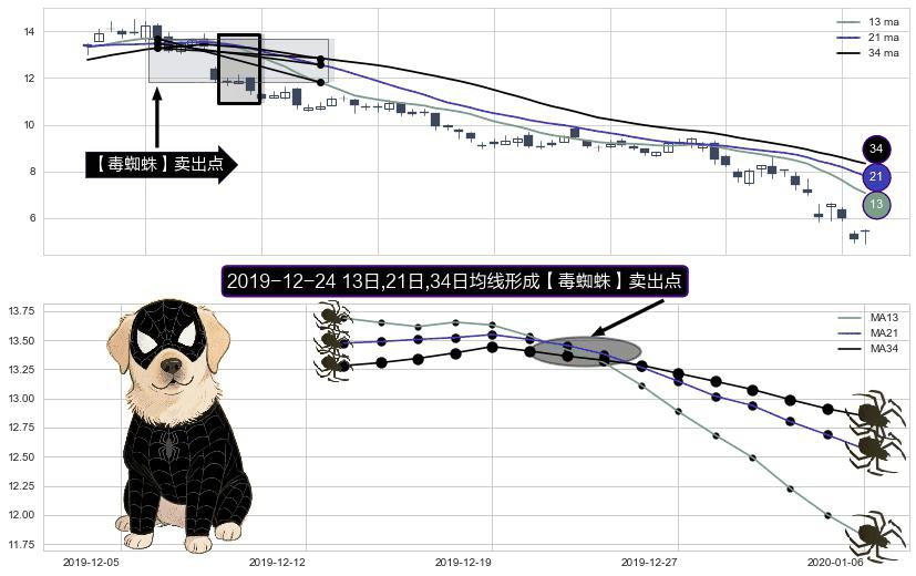 形态多维评估: ⚀ 2019-12-24日显现 13日-21日-34日均线 【毒蜘蛛】卖出点 看空信号,后市看跌,卖出