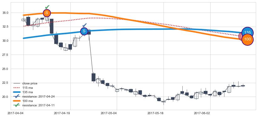 下跌趋势2017-04-04-2017-06-13,均线100, 135确认关键阻力2处