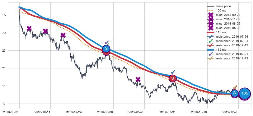 下跌趋势2018-08-01-2019-12-24,均线115, 135确认关键阻力3处
