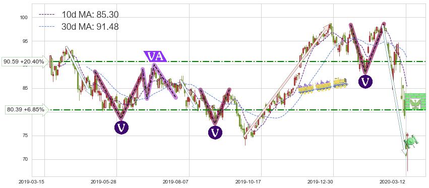 ➣ 【已达成】最小【反转】第一目标价格→(2020-03-11: 79.78 ), 后续继续【反转】下跌动力微弱,下跌较小