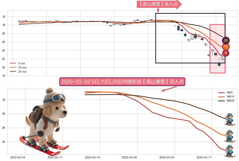 ⚀ 2020-02-14日-2020-03-13日显现 5日-10日-20日均线 【高山滑雪】买入点 看多信号,后市看涨,买入