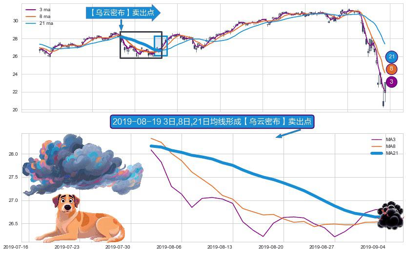 ⚀ 2019-08-01日-2019-09-04日显现 3日-8日-21日均线 【乌云密布】卖出点 看空信号,后市看跌,卖出