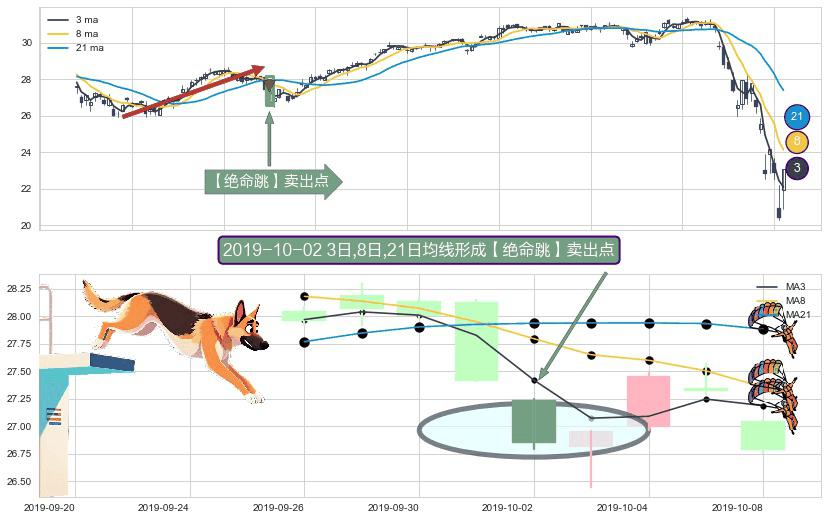 ⚀ 2019-10-02日显现 3日-8日-21日均线 【绝命跳】卖出点 看空信号,后市看跌,卖出