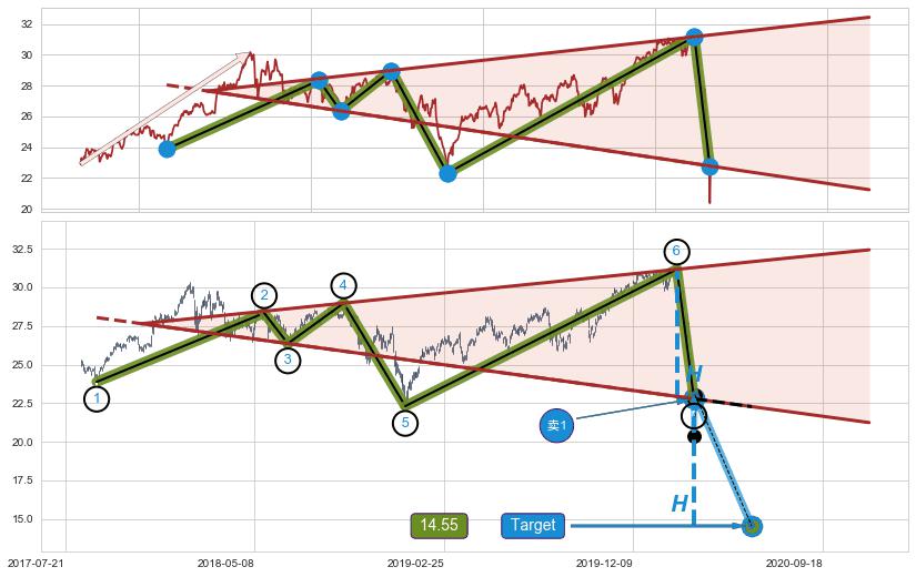 | 5 🅚:【战机起航】卖出点 ➕ 📐:扩散三角反转下行突破支撑位破位, 猜想持续下沉下跌,被突破的支撑位已变为阻力位 ☞ 看空信号 ⇥ 【均线】交织【图形】⇥ 综合量化分数: 14 | > |