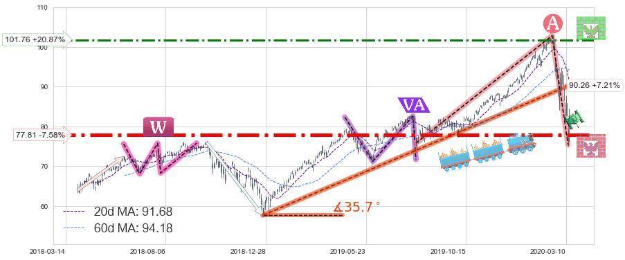 ✂️ 2018-12-24-2020-03-11上升趋势存在反转[风险],其原上升趋势的支撑位(90.26)已破位[强阻力信号],原上升趋势角度: 35.7˚