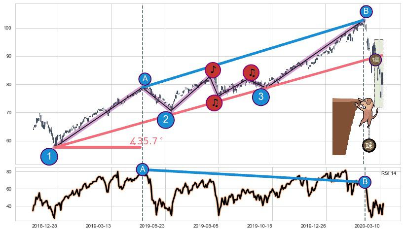 ➢ 上升趋势【顶点B】比【顶点A】高⤴️,【RSI】指标【顶点B】比【顶点A】低⤵️