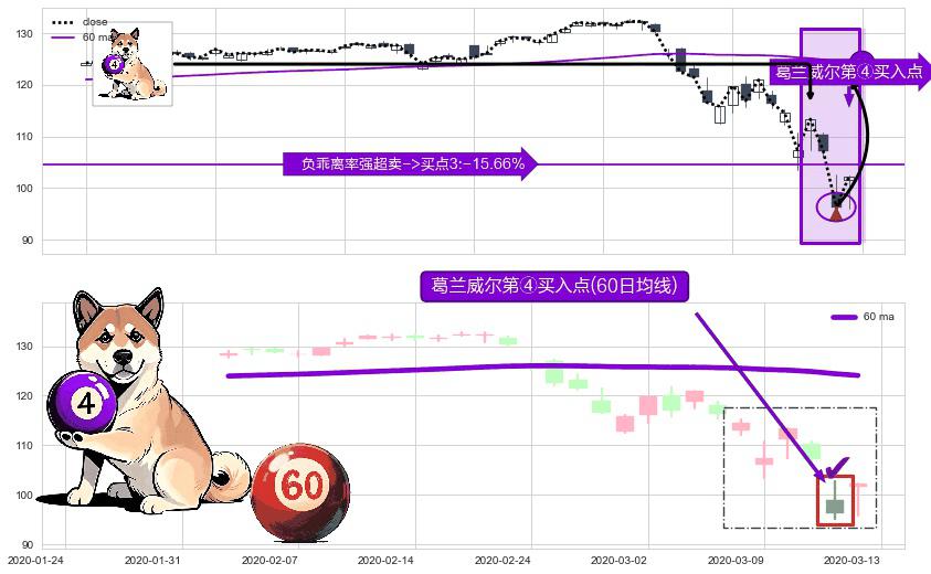 形态多维评估: ⚀ 2020-03-12-日显现 葛兰威尔均线 60日均线 第④买入点 下降趋势均值回复的短线反弹信号,后市看涨,买进信号