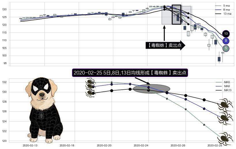 形态多维评估: ⚀ 2020-02-25日显现 5日-8日-13日均线 【毒蜘蛛】卖出点 看空信号,后市看跌,卖出